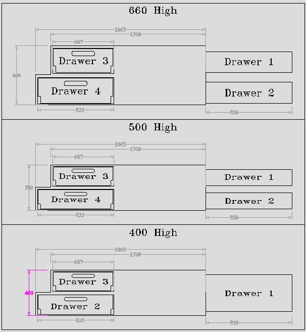 The Conversion kit, which is fully assembled, has 4 Sliding Drawers. 2 Side-opening Drawers and 2 rear drawers (400mm unit has only 2 side drawers and 1 single rear drawer).